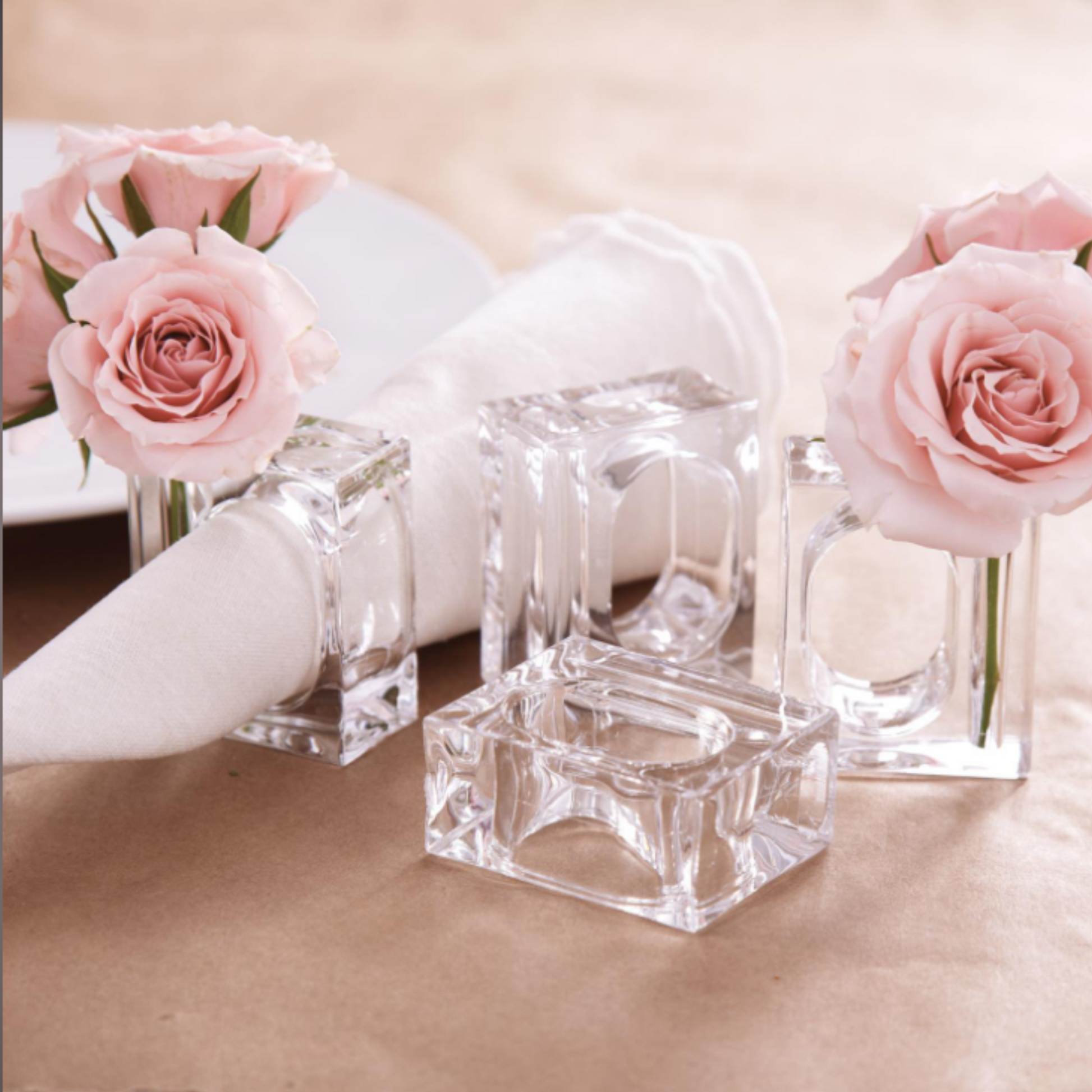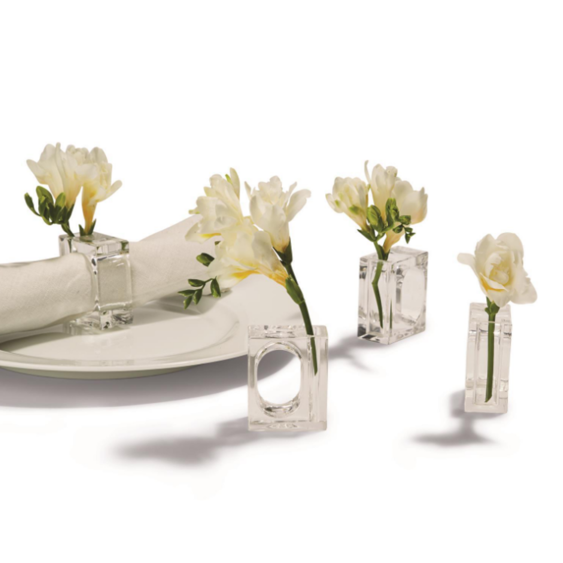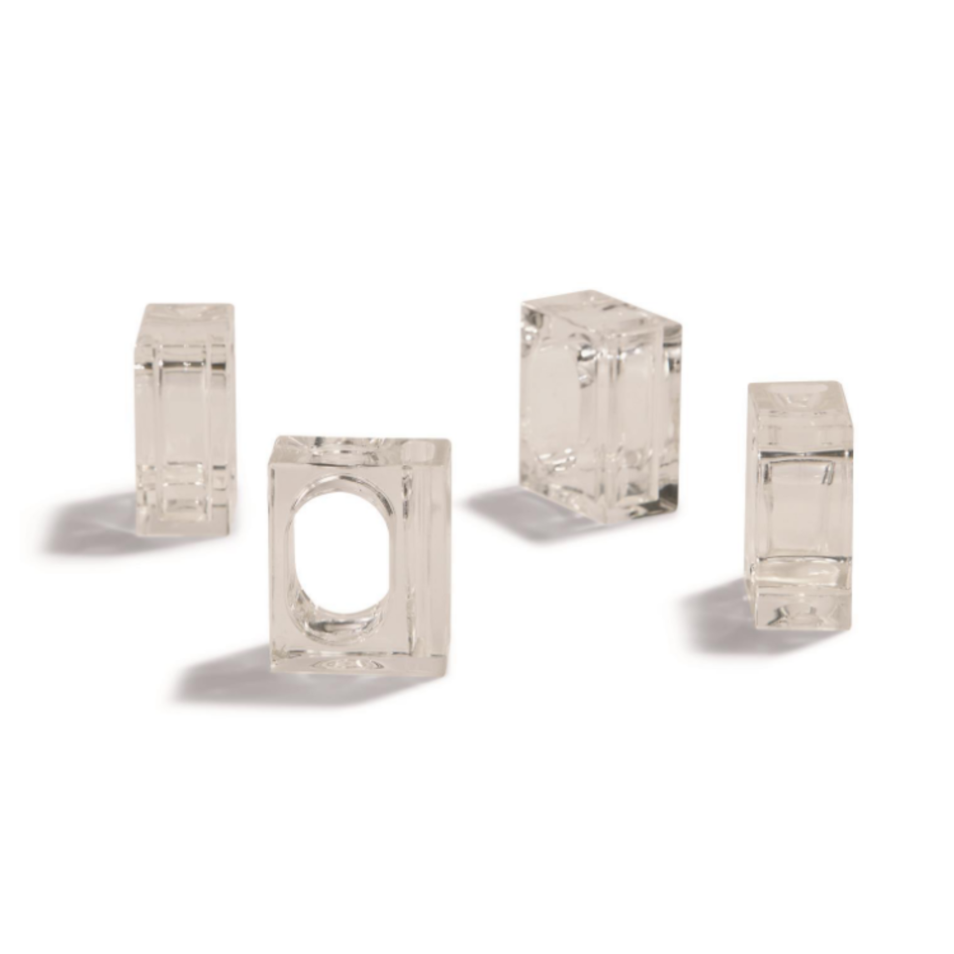 Set de cuatro servilleteros de acrílico con un lado hueco ideal para integrar cualquier accesorio de decoración: flores, colores, texturas; lo que aporta inmensas posibilidades a la hora de personalizar la mesa.