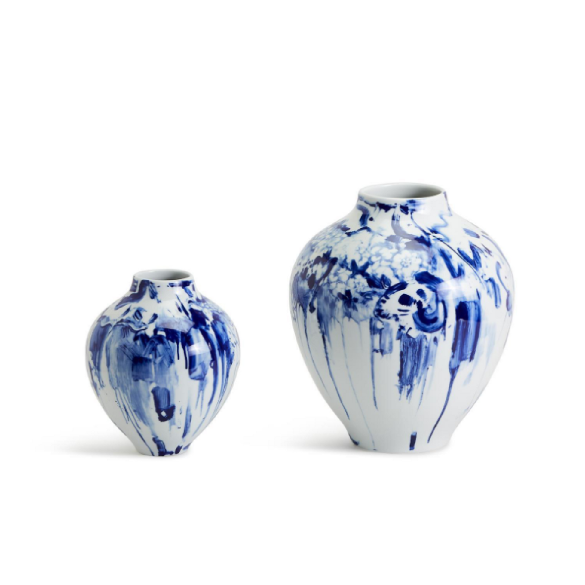 Base de cerámica blanca con pintado abstracto tipo mancha en tono azul rey. Se venden por separado, dos tamaños disponibles