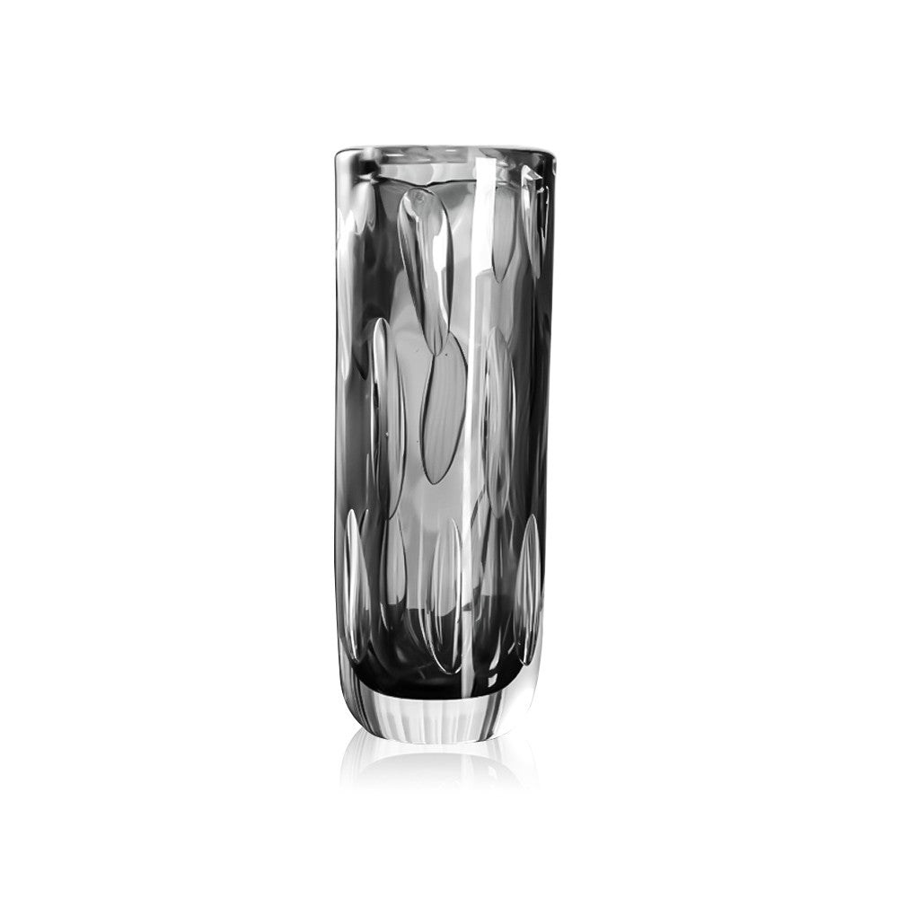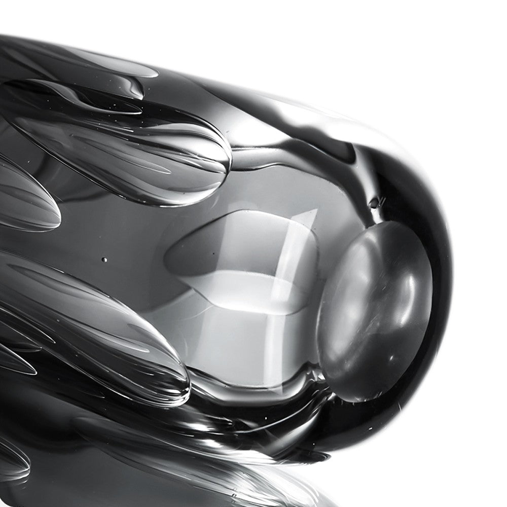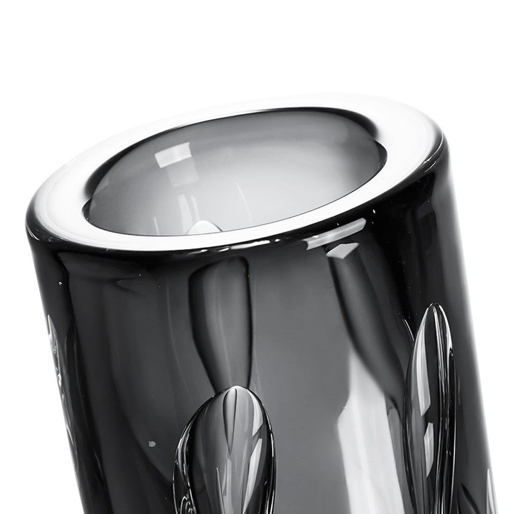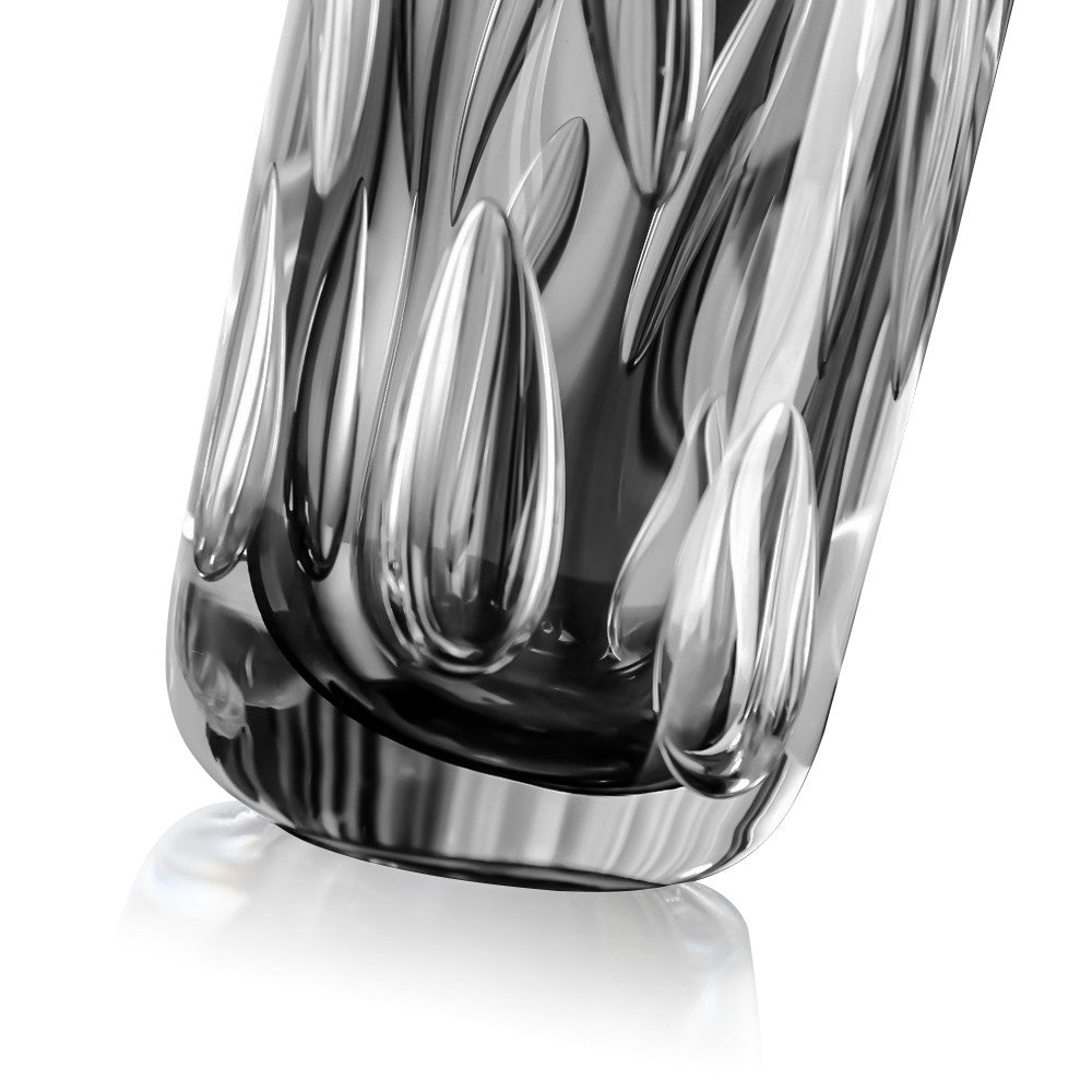 Florero de muy grueso vidrio de color gris traslúcido con burbujas de aire en el interior.