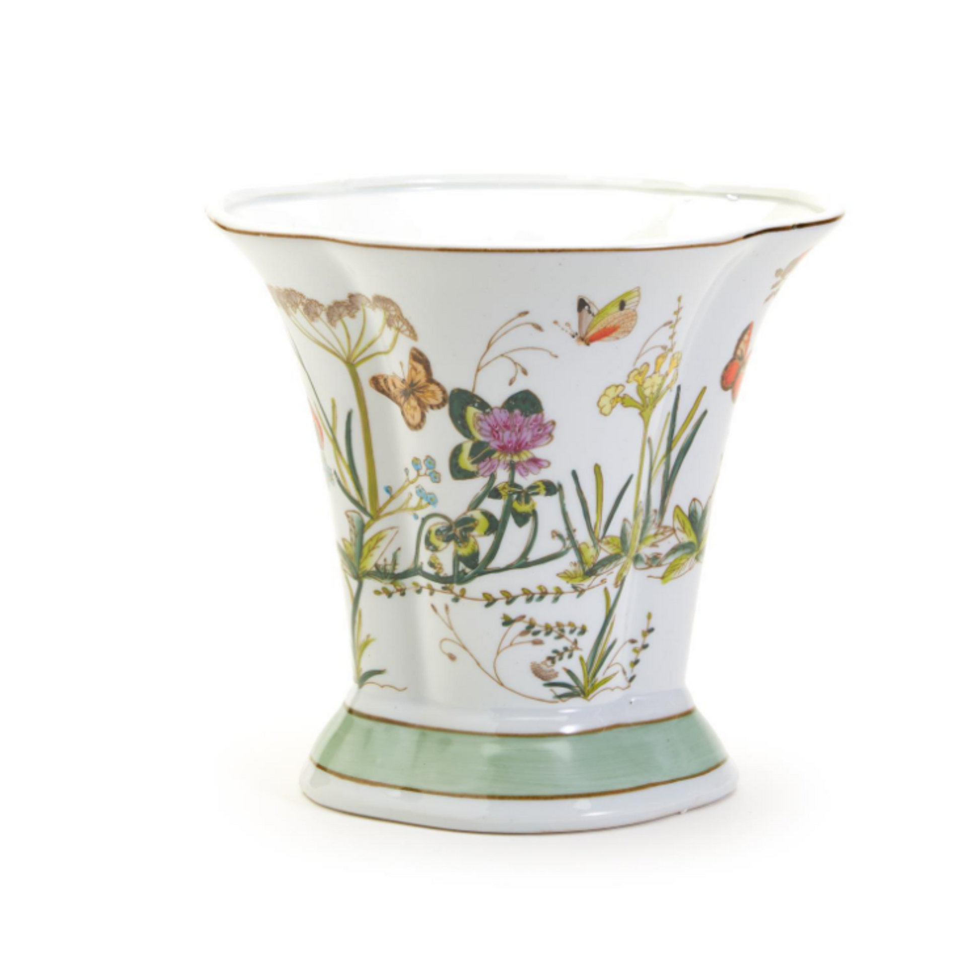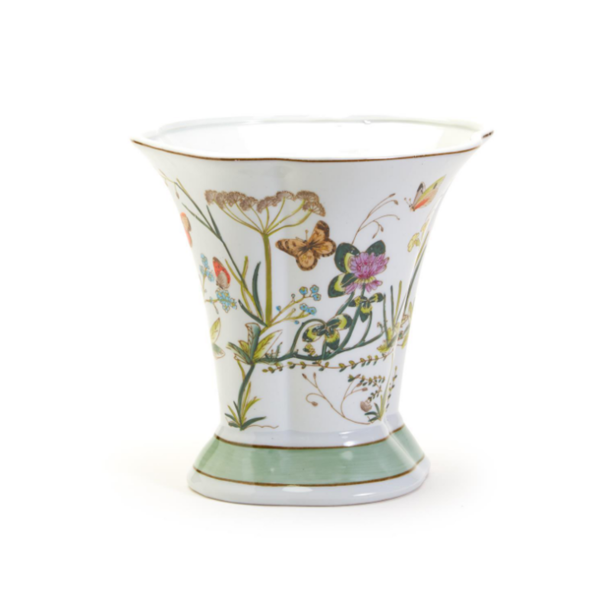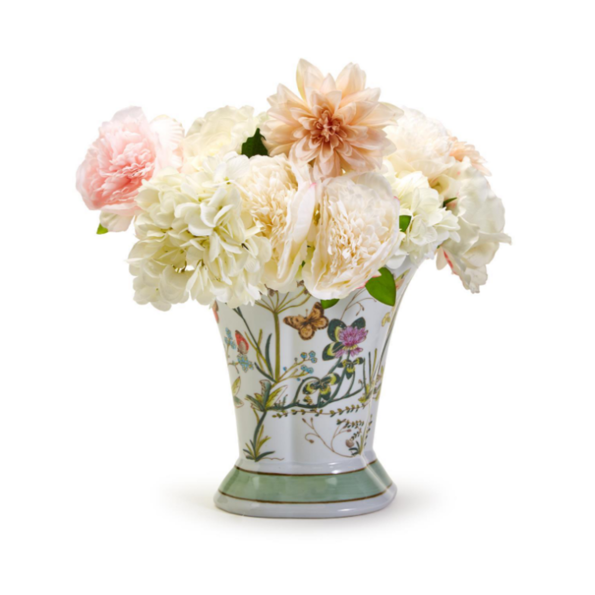 Integra a tu hogar elegancia y belleza con esta bella base pintada a mano en estilo vintage. Base de cerámica pintada con motivos primaverales: flores, follaje, mariposas, en tonos alegres con fondo blanco. Usa este maravilloso acento para exhibir tus arreglos florales favoritos.