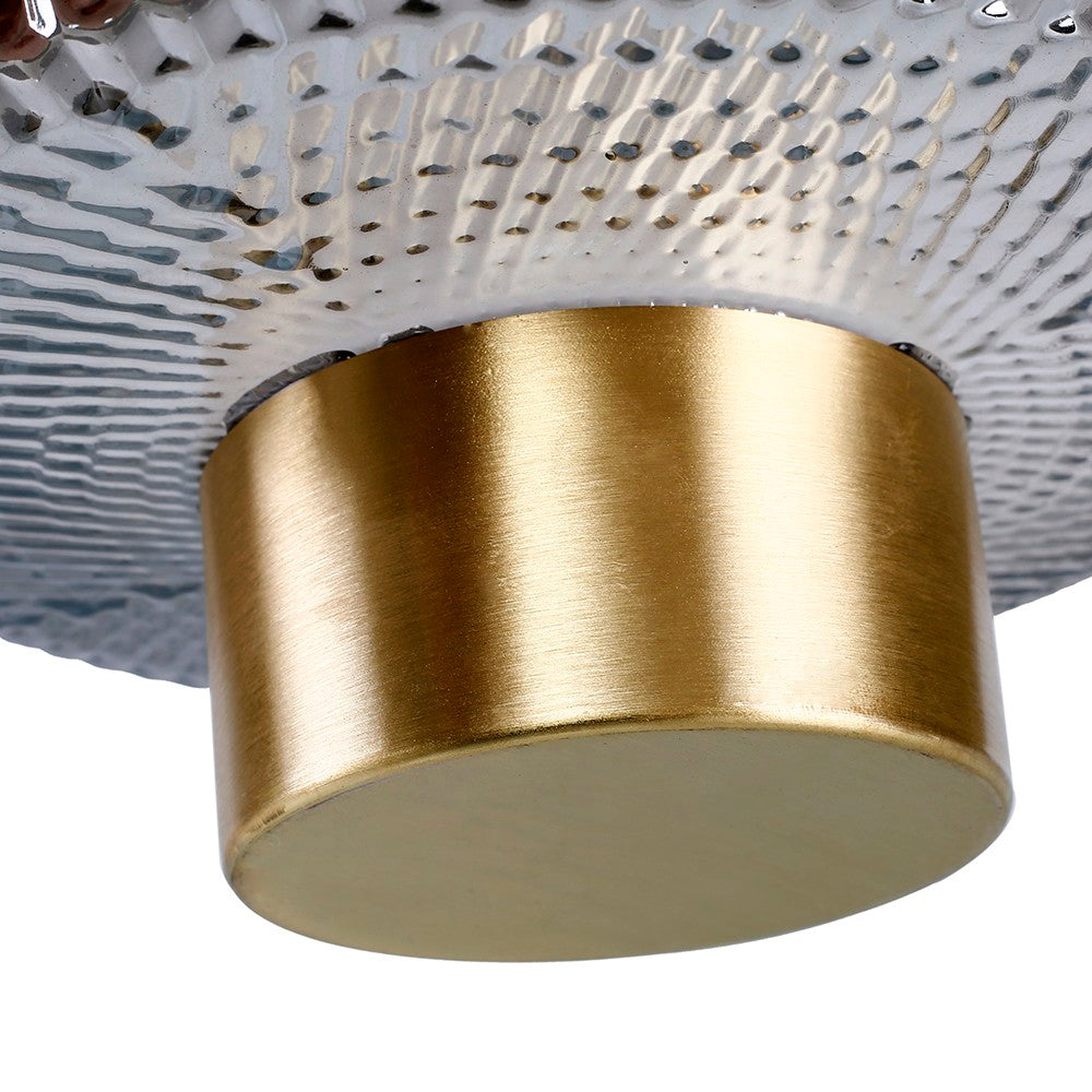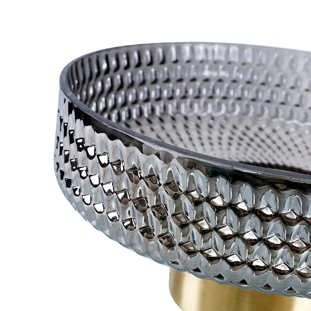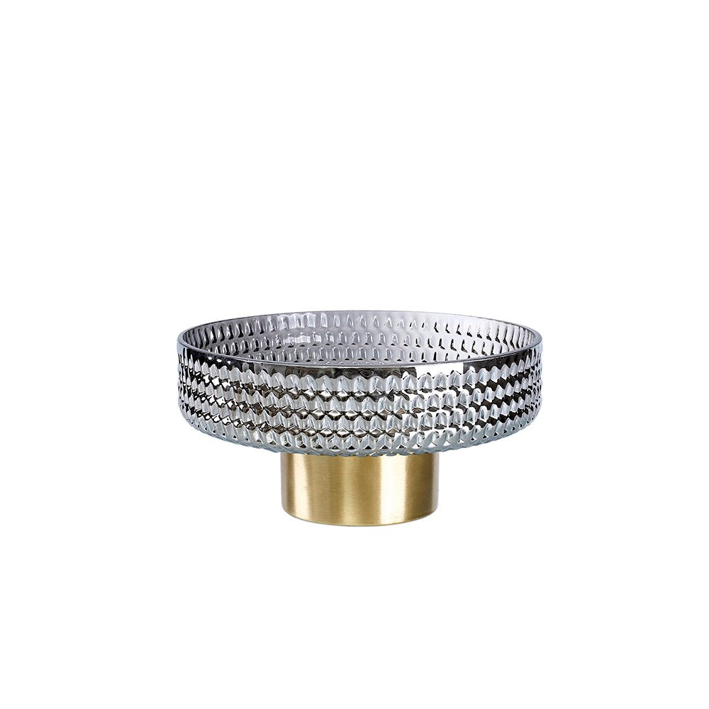 Base de vidrio redonda, baja con textura de círculos y base en color dorado metálico.