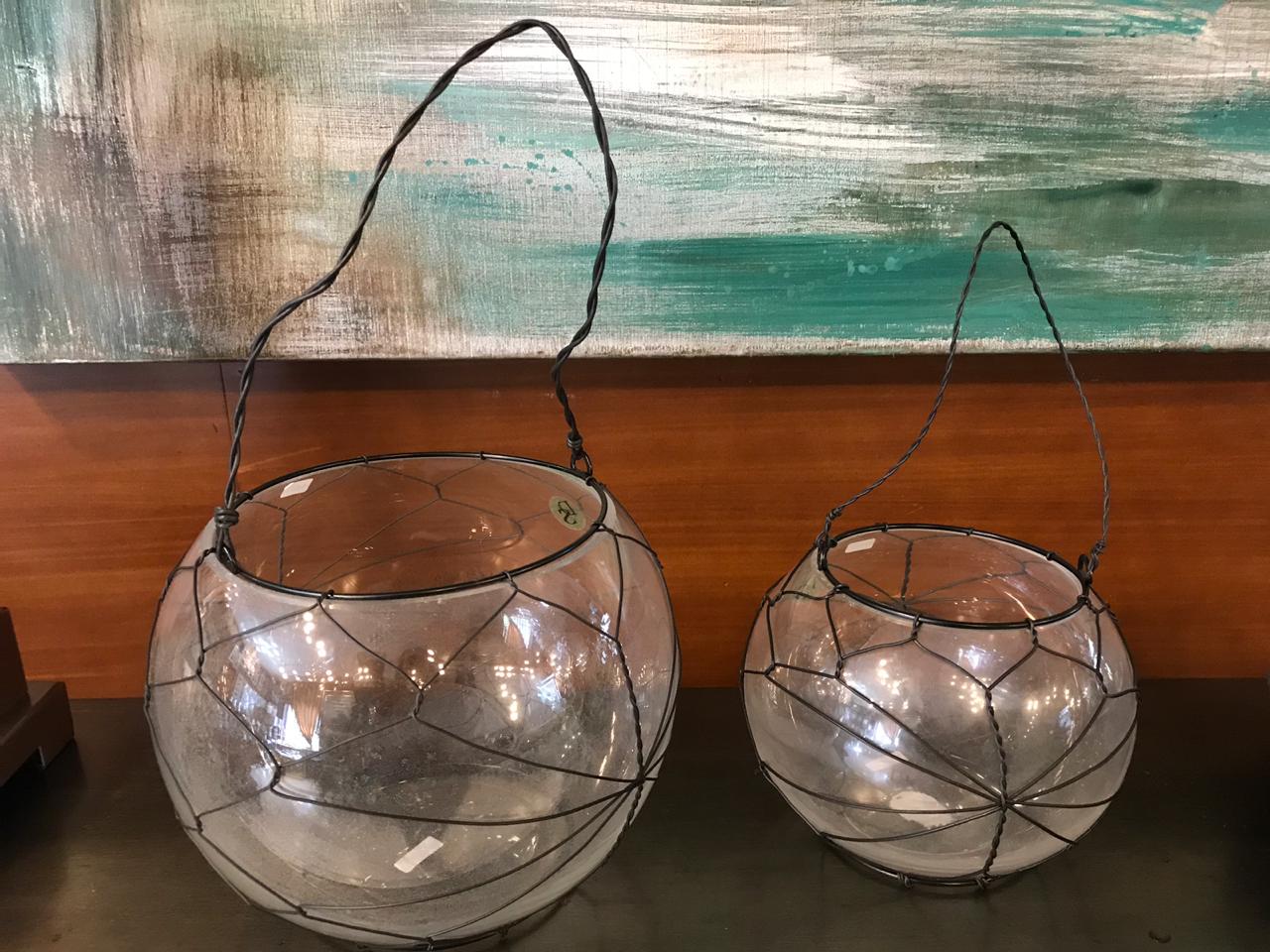 Bowl de vidrio tipo pecera con estructura de alambre color negro integrada con colgante. Dos tamaños disponibles.