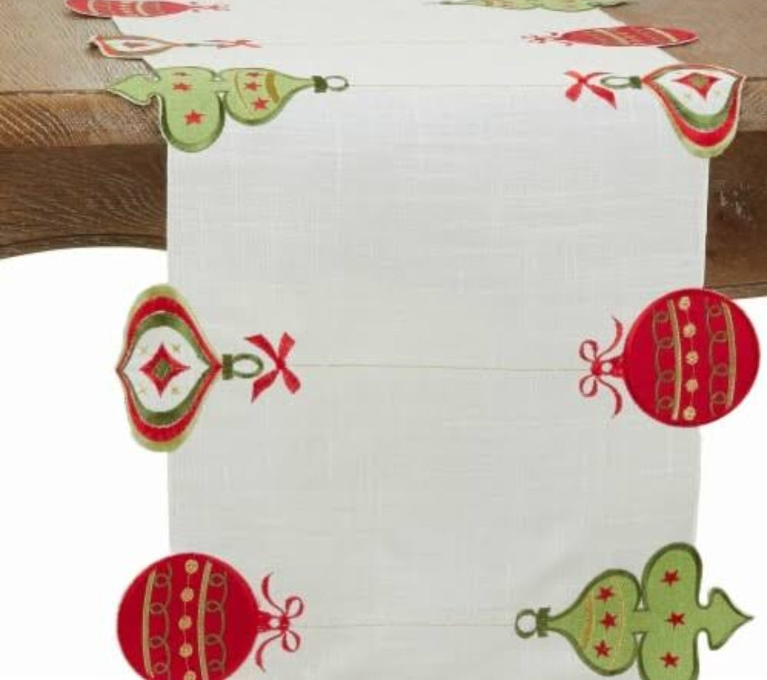 Dale un toque navideño a tu mesa con este encantador camino de mesa bordado blanco. Las esferas en las orillas lo adornan con colores clásicos navideños, creando un ambiente acogedor y festivo. ¡Añade el encanto de la navidad a tu casa!