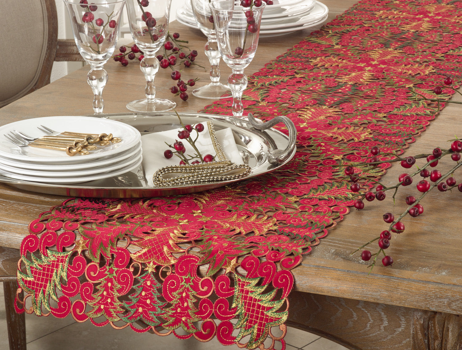 ¡Embellece el interior de tu hogar con el Camino con Suaje Pinos! Este impresionante camino de mesa reúne siluetas de pinos, grecas, hilo dorado, y un color rojo vibrante, todo en una longitud de 274 cm y un ancho de 40 cm. Sus líneas clásicas atemporales harán que siempre sientas un ambiente cálido y acogedor. ¡Entra y siente la magia que fluye!