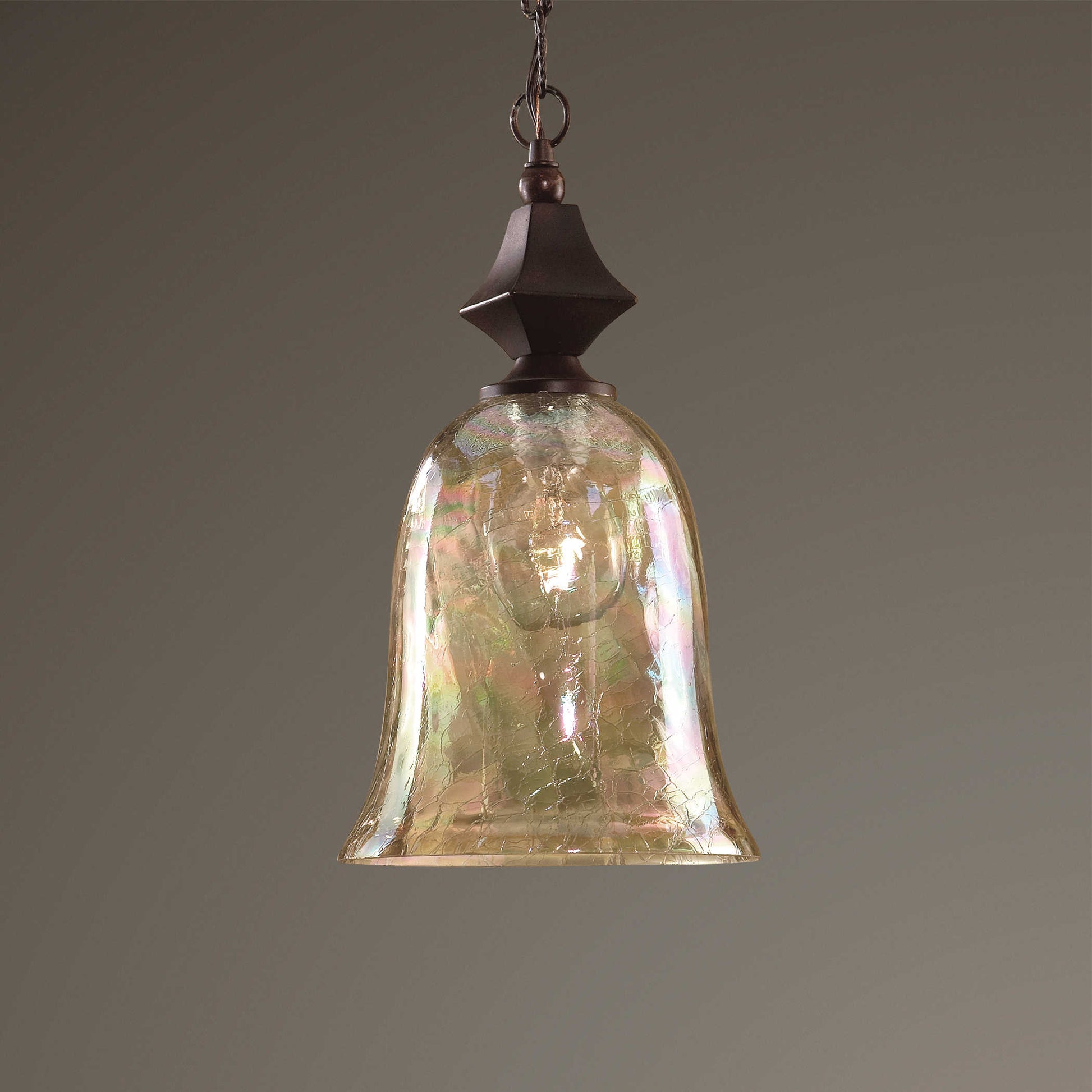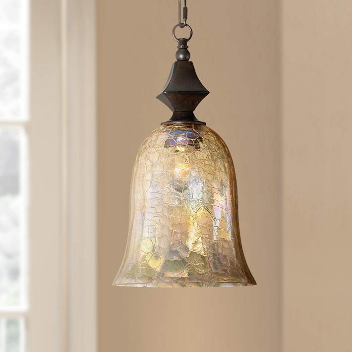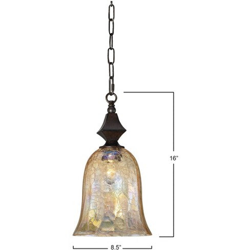 Candil pendiente estilo rústico con cadena en color cobre y vidrio con textura iridescente de acabado antiguo.