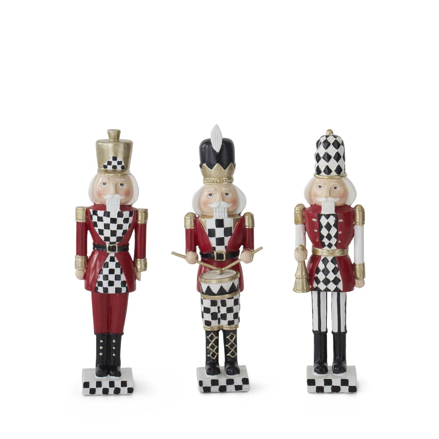 Figura decorativa del cascanueces o soldado navideño en tonos rojo, y dorado y cuadros blanco y negro. Ideal para la decoración navideña.