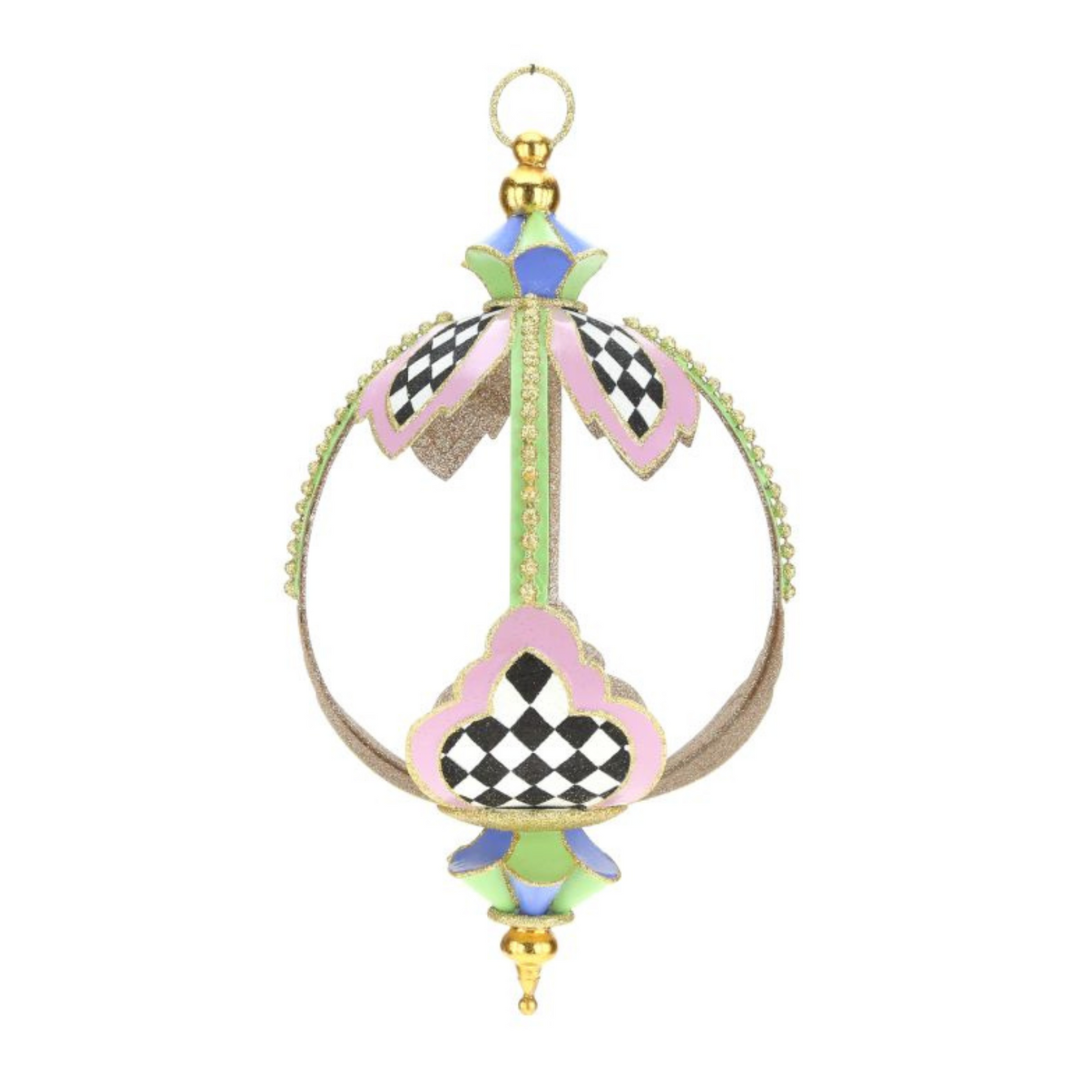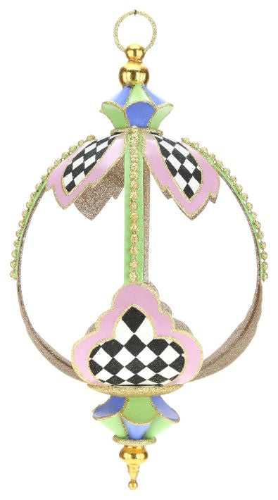 Adorno colgante tipo esfera de estructura delicada en forma redonda con remate en los extremos en tonos pasteles y cuadros blanco y negro. Ideal para decorar la pascua o cualquier festividad en tonos pasteles.