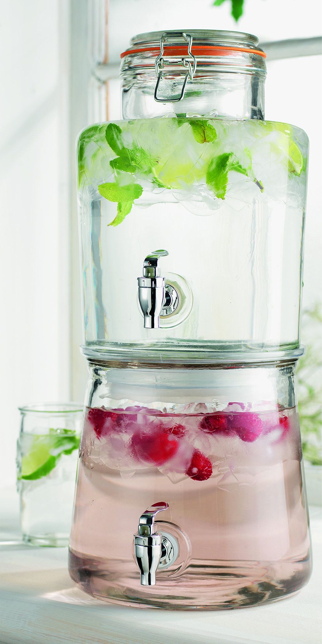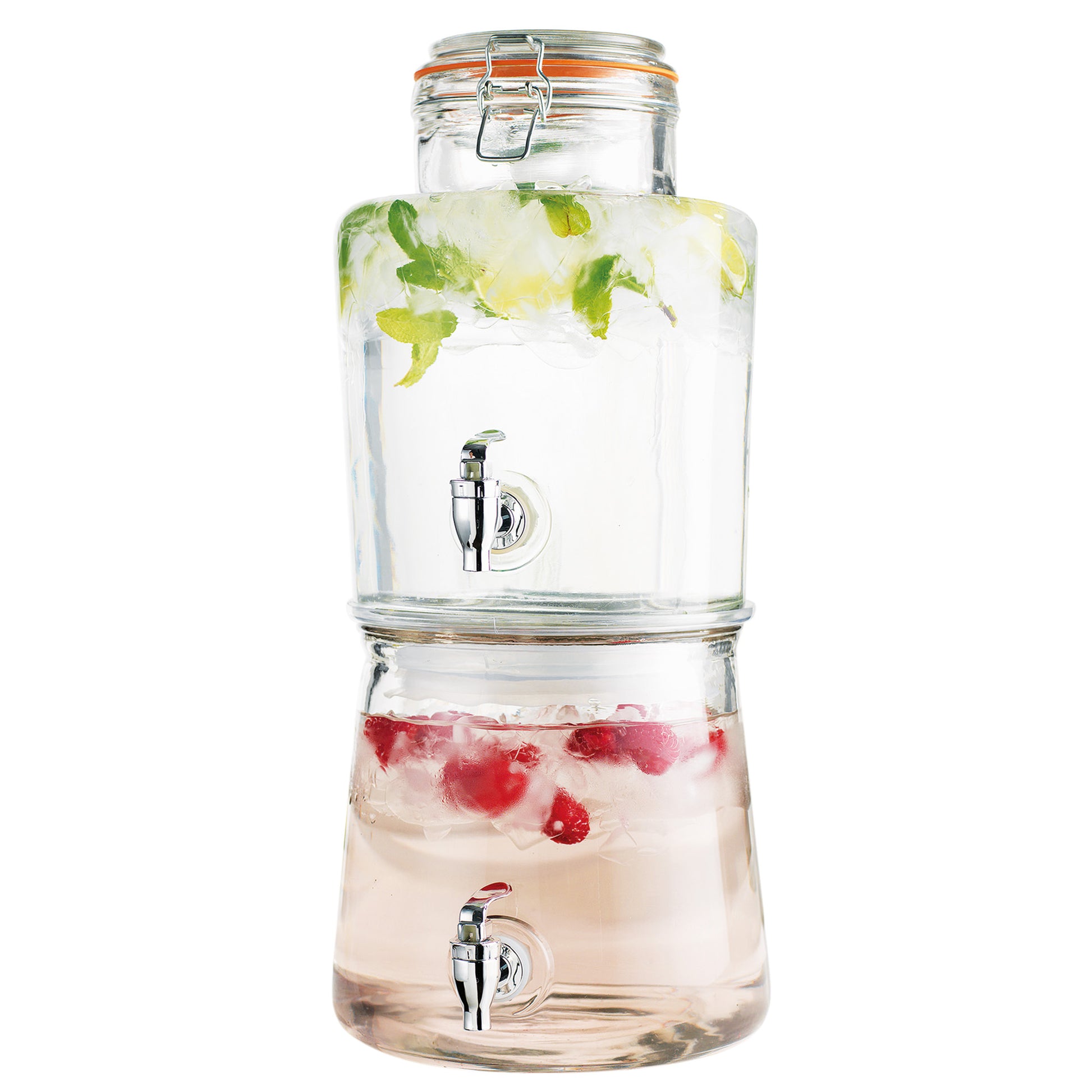 Dispensador doble para bebidas de vidrio trasparente con tapa.