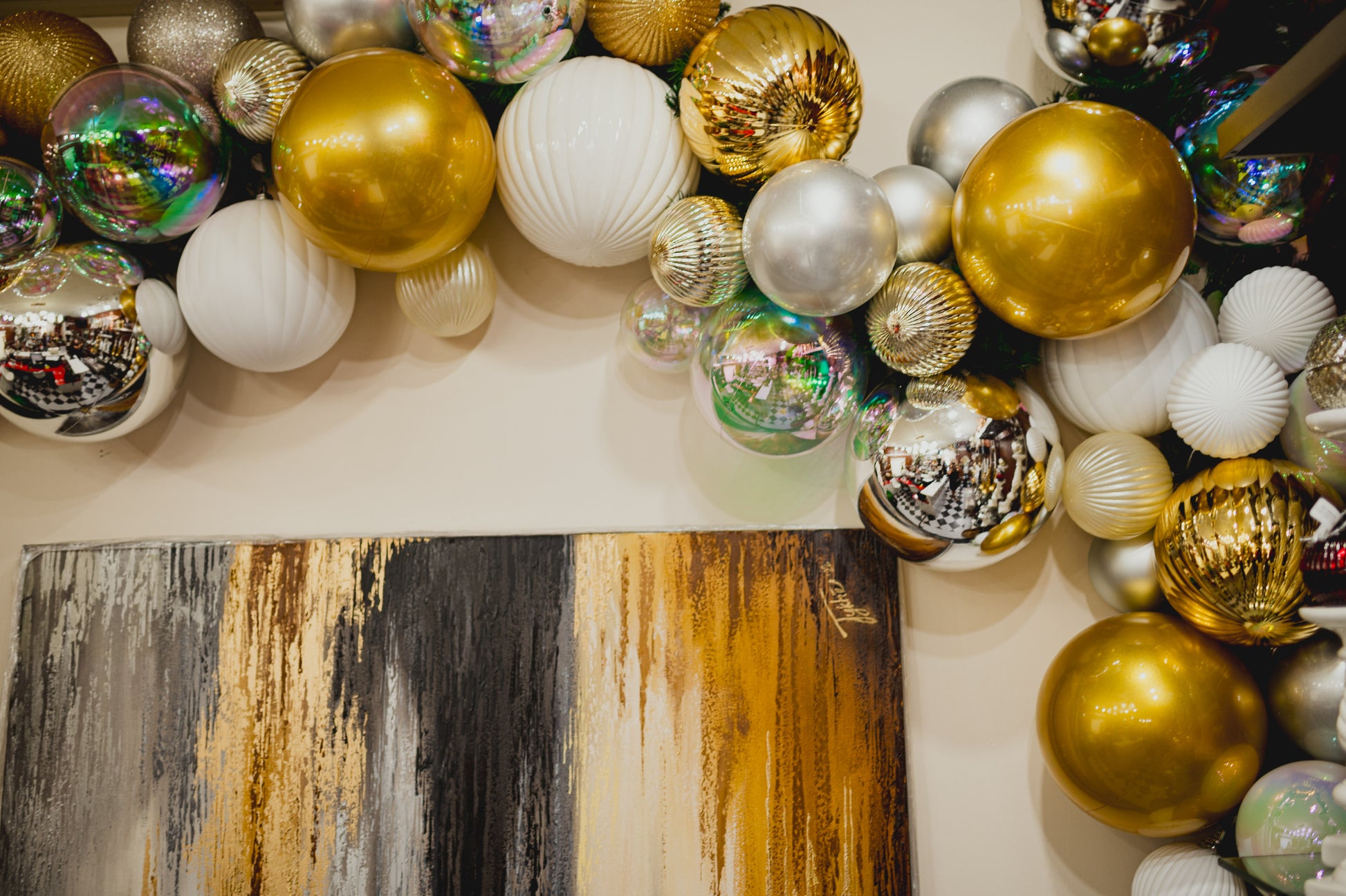 Esfera gigante redonda con textura de gajos en color blanco metálico. 12" de diámetro.