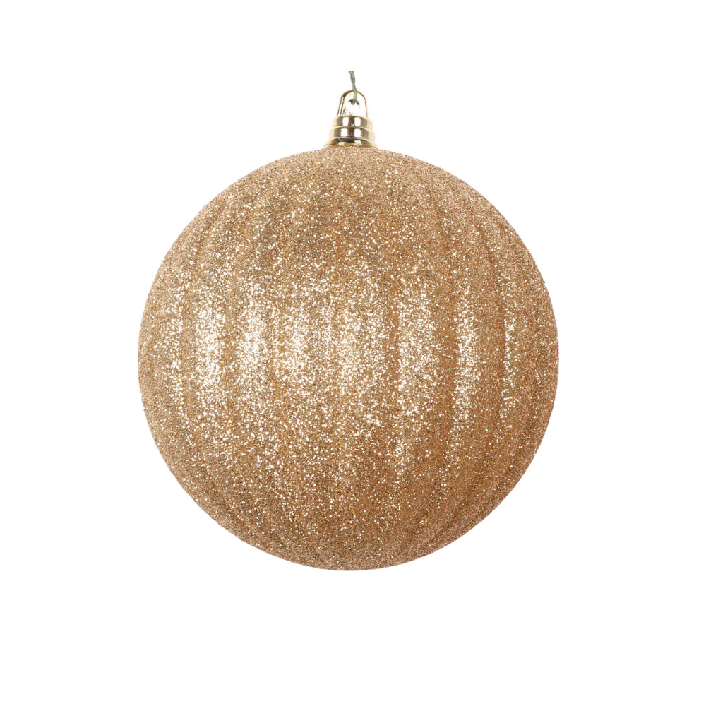 Esfera gigante redonda con textura de gajos en color dorado glitter. 10" de diámetro.