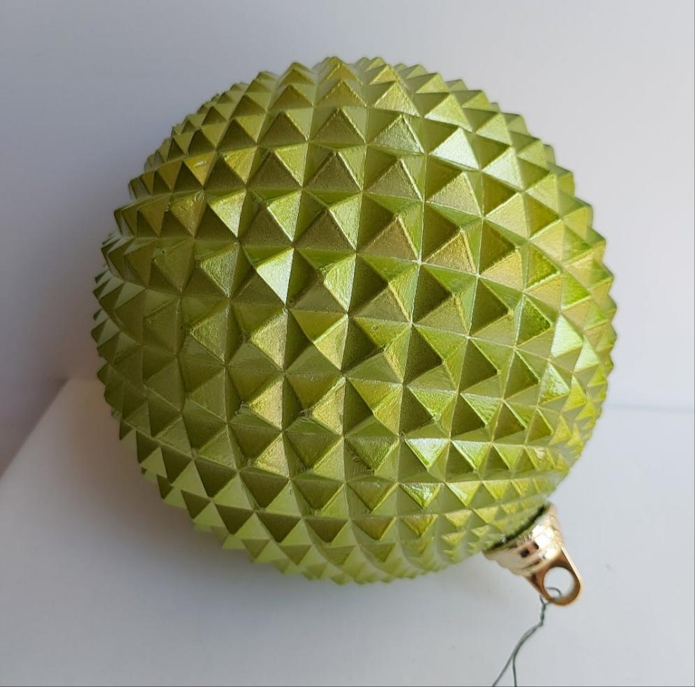 Esfera gigante color verde limón metálico de 10" de diámetro con textura de pirámides.