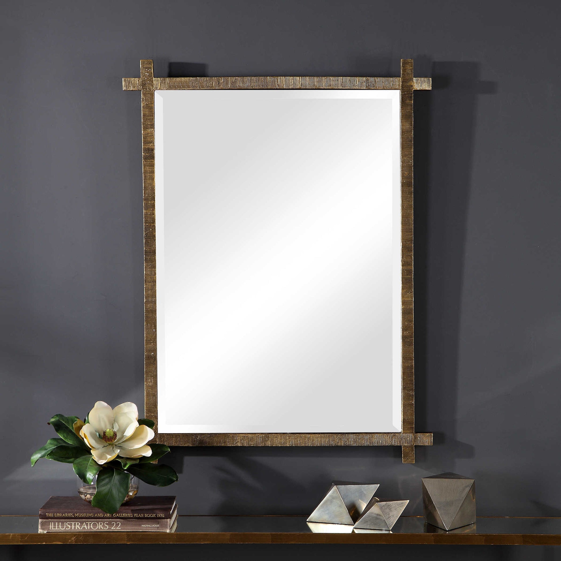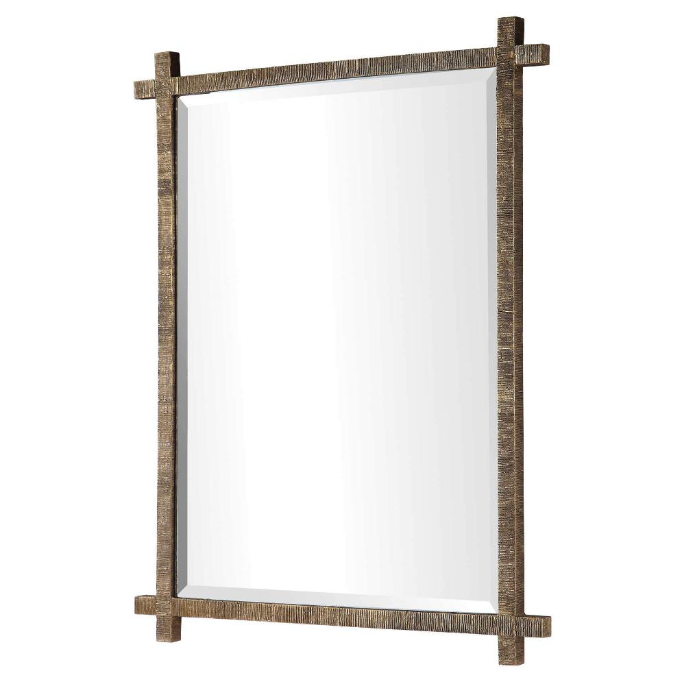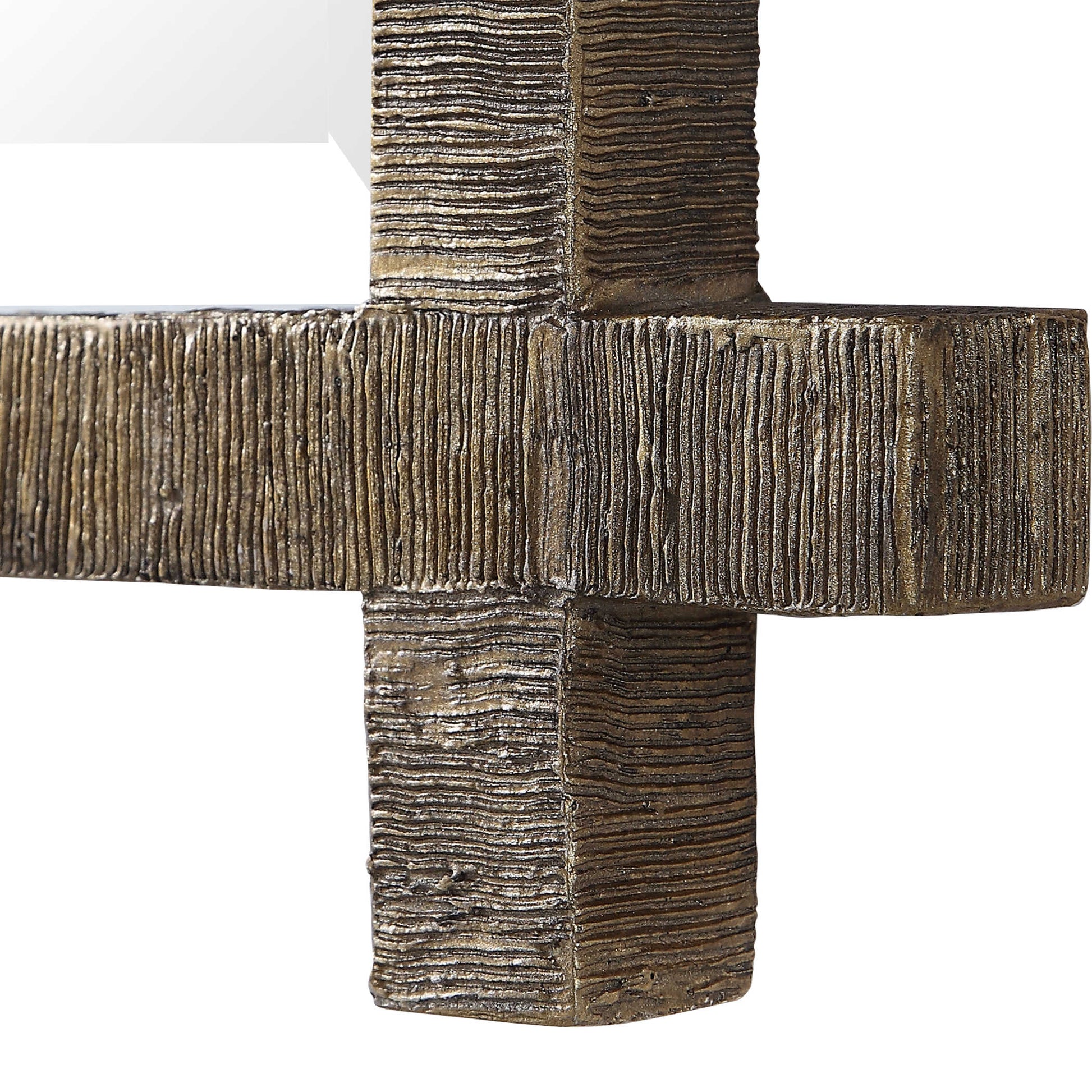 Espejo biselado con marco en oro antiguo con textura rallada con aire tribal. Puede ser colgado en horizontal o vertical. 76 x 99 cm