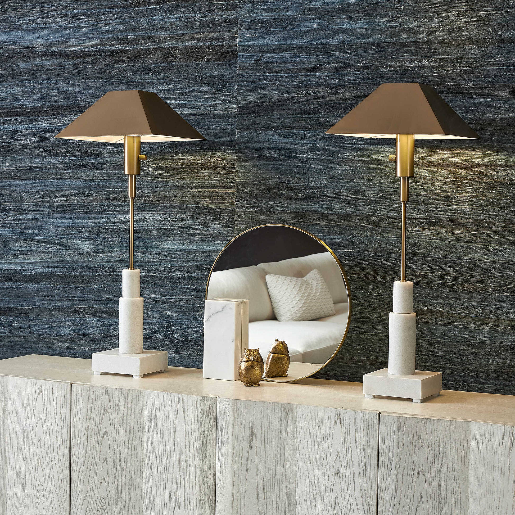Espejo con fino acabado enmarcado en una delgada capa de acero inoxidable color bronce montado en una gruesa pieza de mármol blanco. 46 cm de diámetro.