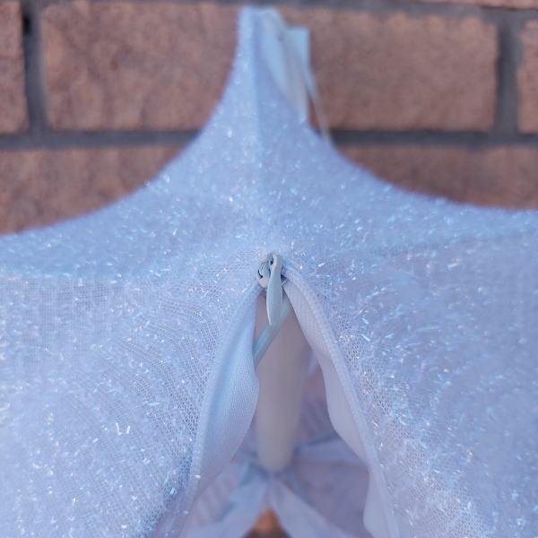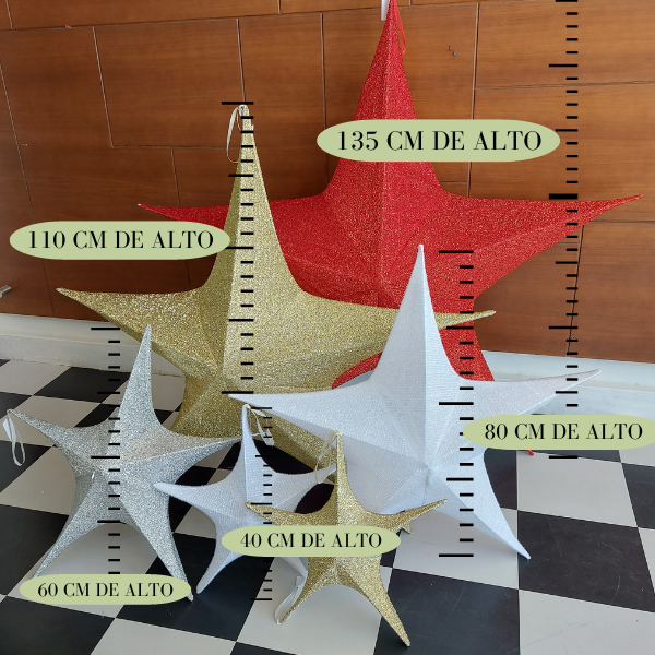 Adorno colgante en forma de estrella con estructura de fierro y tela metalizaada en color negro.. El adorno se desarma y dobla de forma muy conveniente para almacenar.