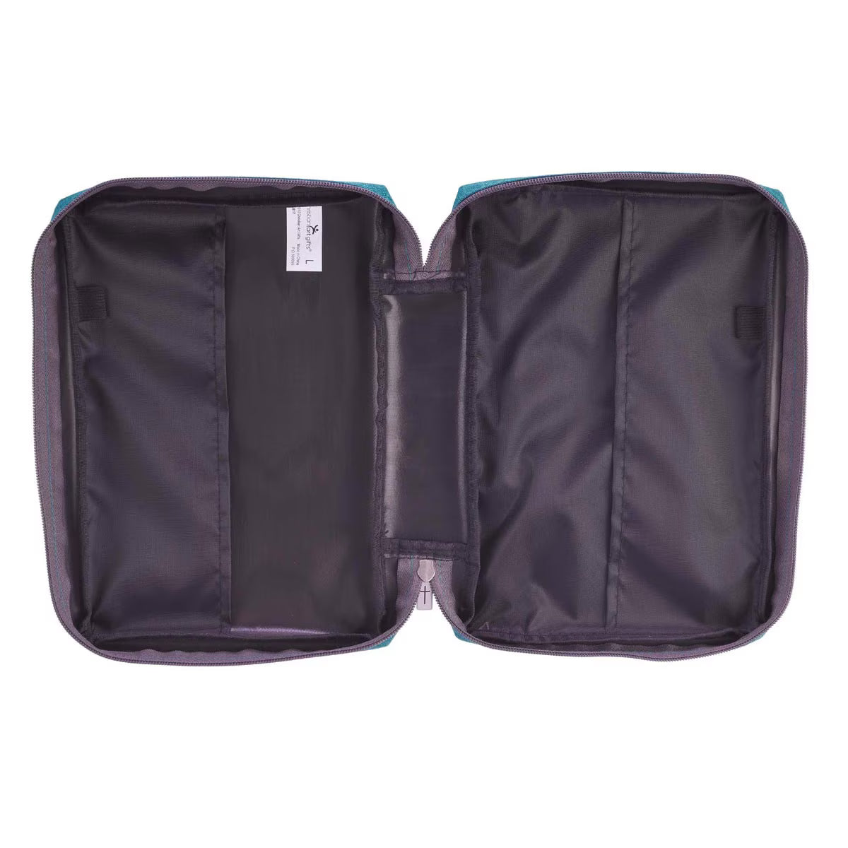 Diseñada para ser resistente y duradera, así como un asa del mismo material que se abre completamente para facilitar su uso. El cierre cuenta con un tirador metálico dorado. En el interior, encontrarás dos presillas para bolígrafos o marcadores.