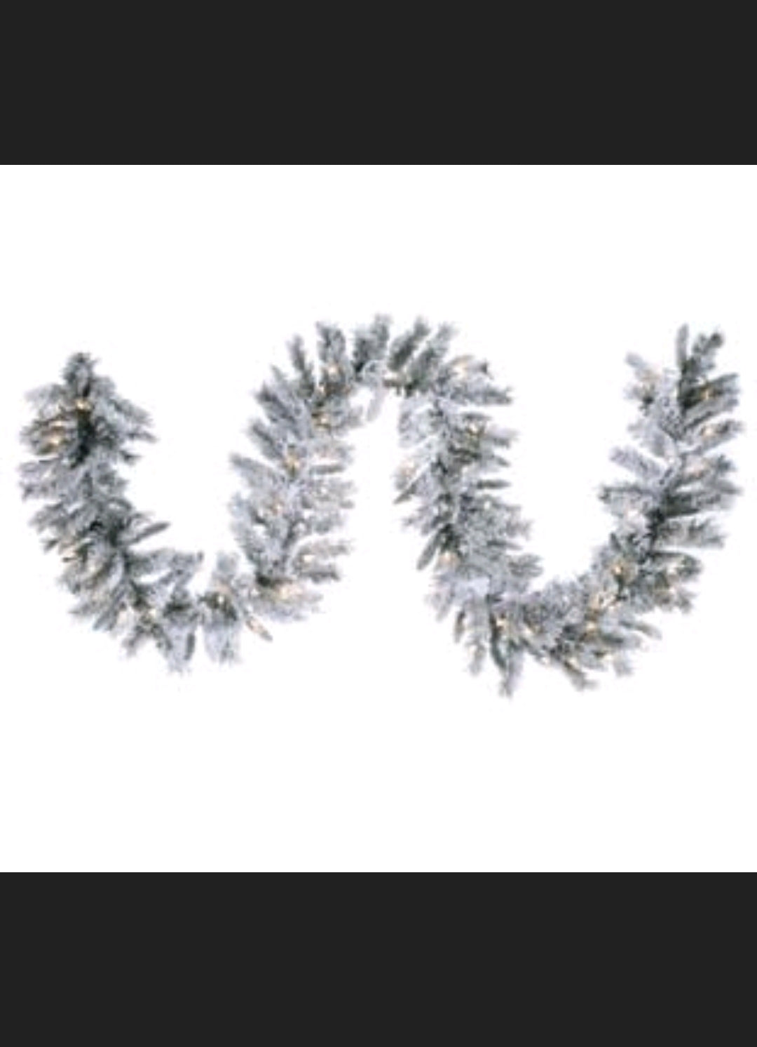 Guirnalda de pino de apariencia nevada con extención eléctrica de luz cálida. 10" de ancho x 9' de largo