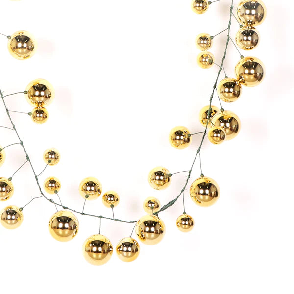 Disfruta de la elegancia de esta guirnalda de esferas doradas y da un toque único a tus decoraciones navideñas. Esta guirnalda dorada se puede usar para complementar guías, pinos o coronas, para crear una hermosa obra maestra navideña. ¡Qué maravilla!