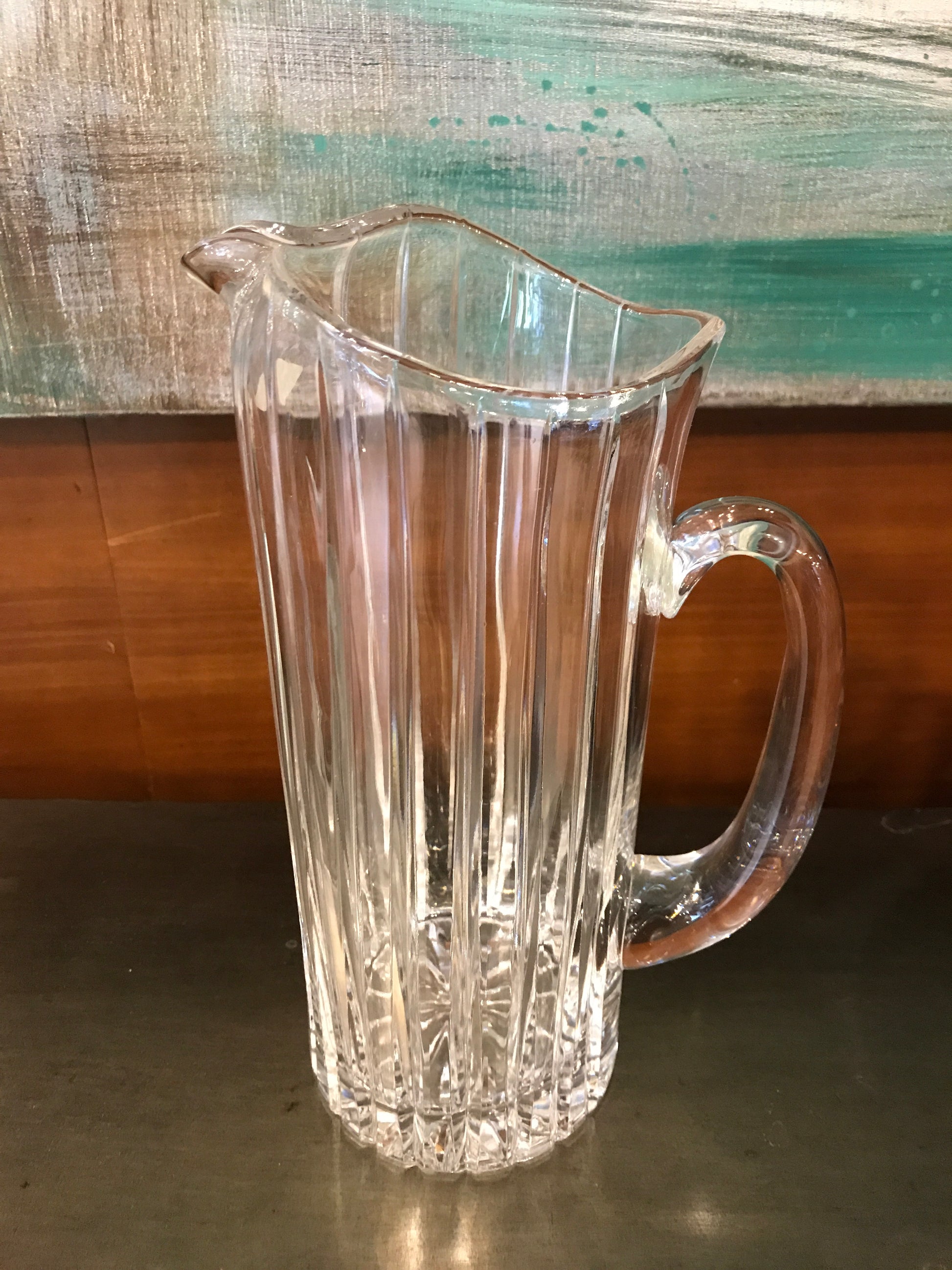 Jarra de cristal con dos texturas diferentes: líneas en el cuerpo y cuadros alrededor del límite superior. Base cuadrada 12 x 12 cm y hasta 23 cm de alto.