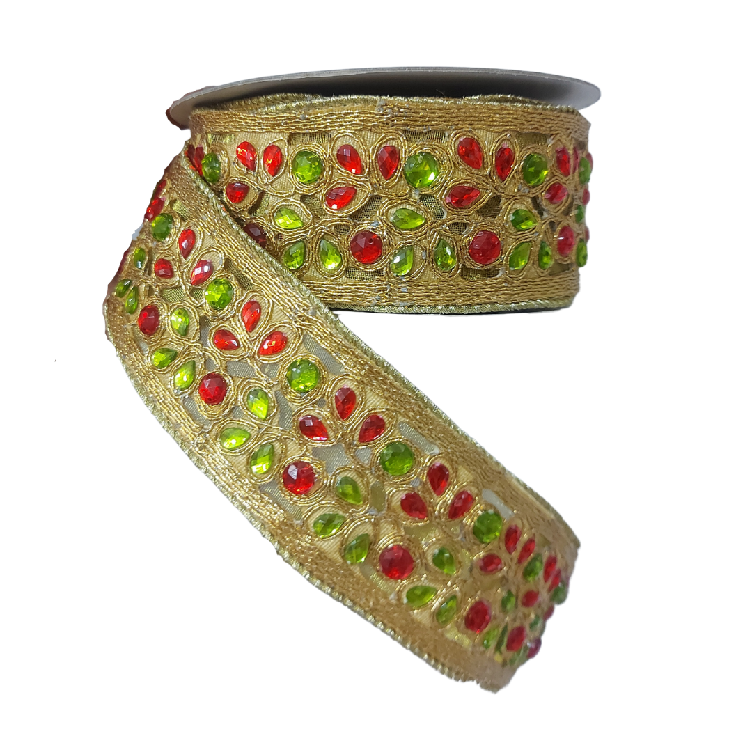 Dale a su hogar un toque navideño con este hermoso listón de pedrería rojo y verde. Las joyas luminosas se destacan sobre el fondo de tela, creando una combinación de colores brillantes y vibrantes. ¡Un 4 cm ancho de 4,5 metros de largo hará que su decoración navideña esté llena de alegría!