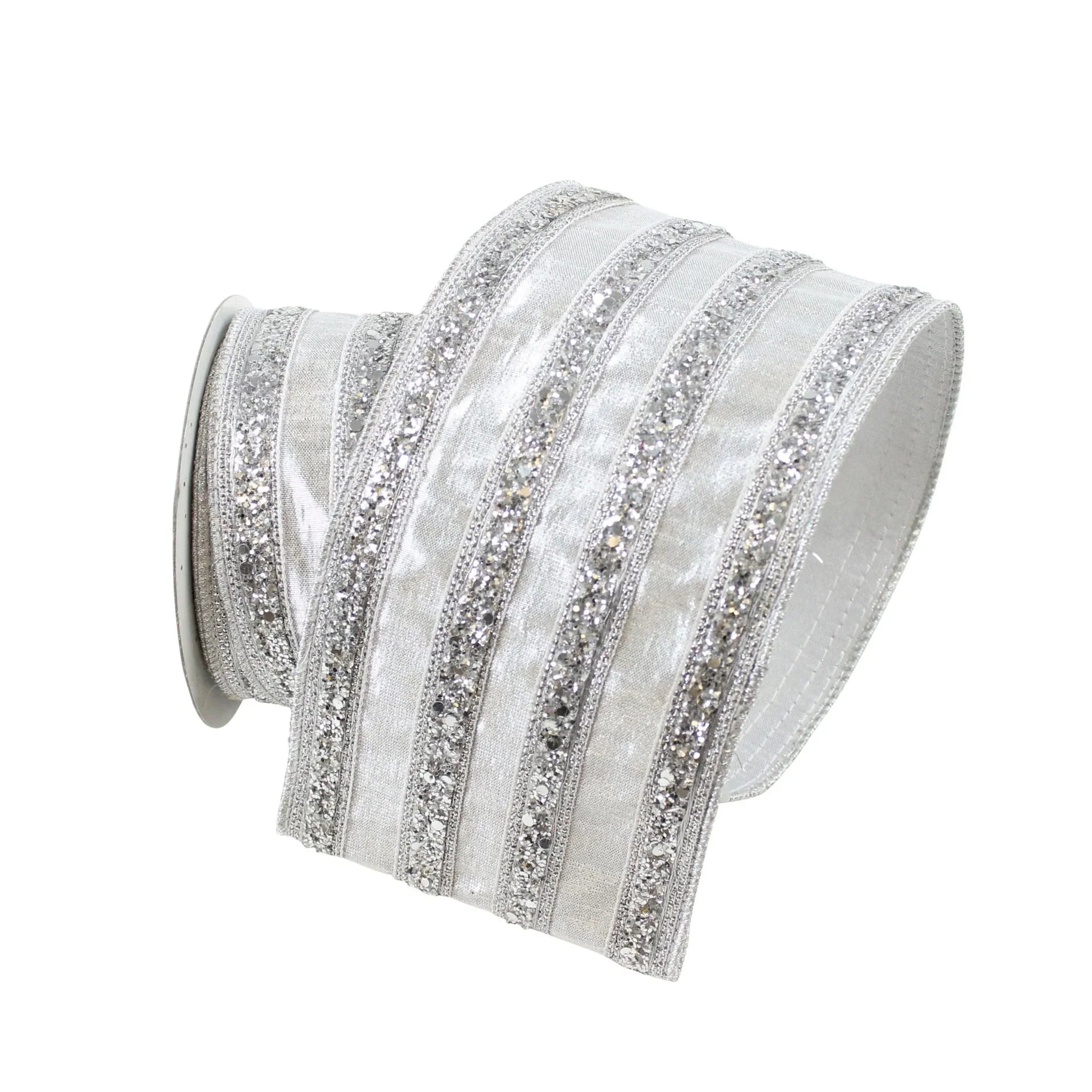 Listón grueso alambrado en color plateado con glitter en líneas del mismo color 10 cm de grueso x 9 mt de largo