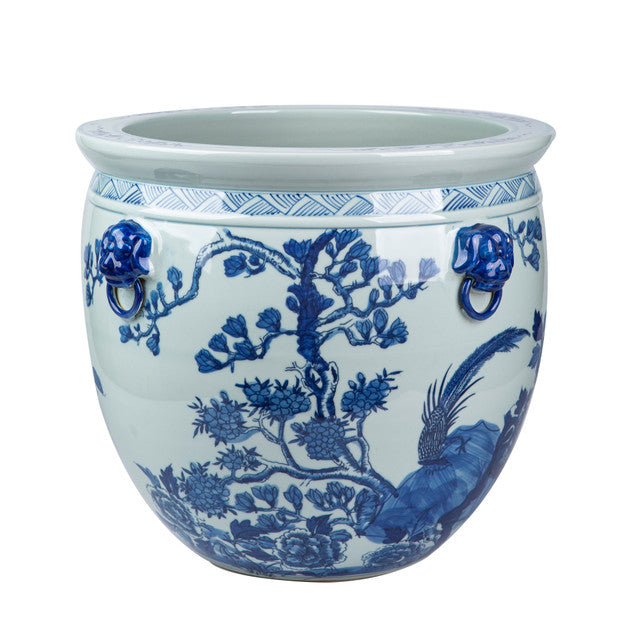 Maceta de porcelana tradicional china elaborada y pintada totalmente a mano con imágenes de árboles y flores. Con decorado en relieve de cabezas de leones apuntando a los cuatro puntos cardinales. Ideal para resguardar la puerta de la casa.