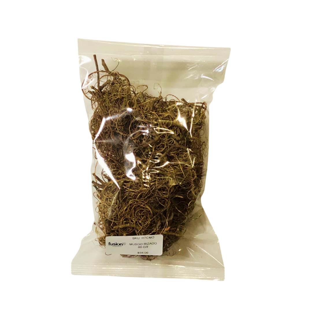 Musgo natural color café de apariencia rizada. Bolsa de 60gr.