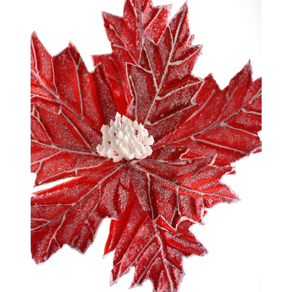 Vara decorativa navideña en forma de nochebuena de tela en color roja con apariencia nevada. 56 cm de largo x 33 cm de diámetro