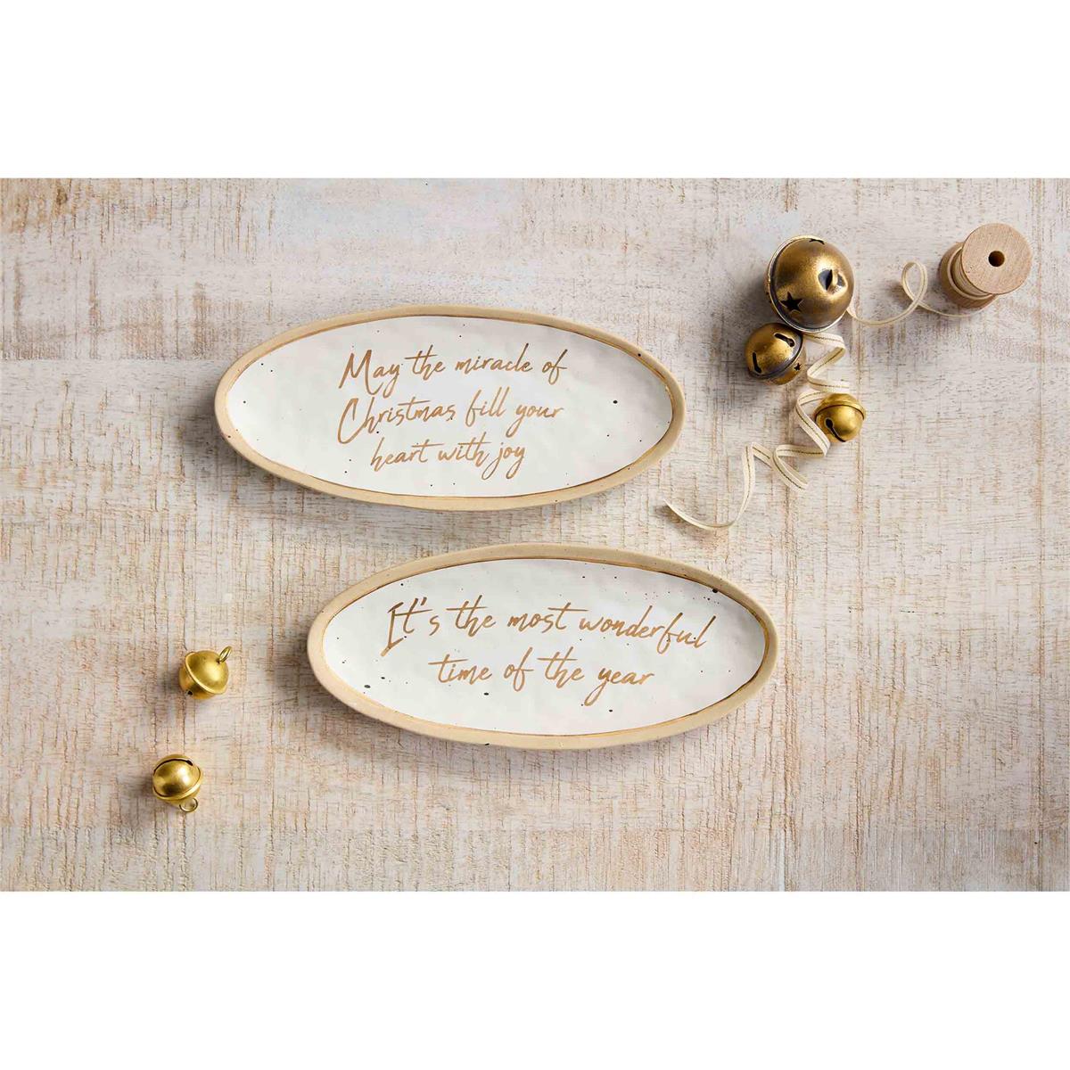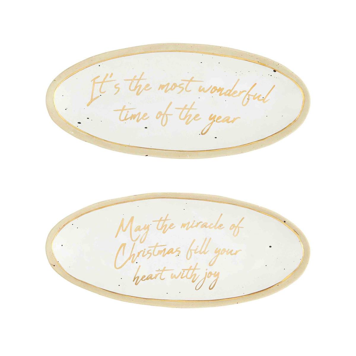 Platón de cerámica blanca con acabado antiguo con letrero en tinta dorada que recuerda la noche mágica del nacimiento del niño Dios y la navidad.