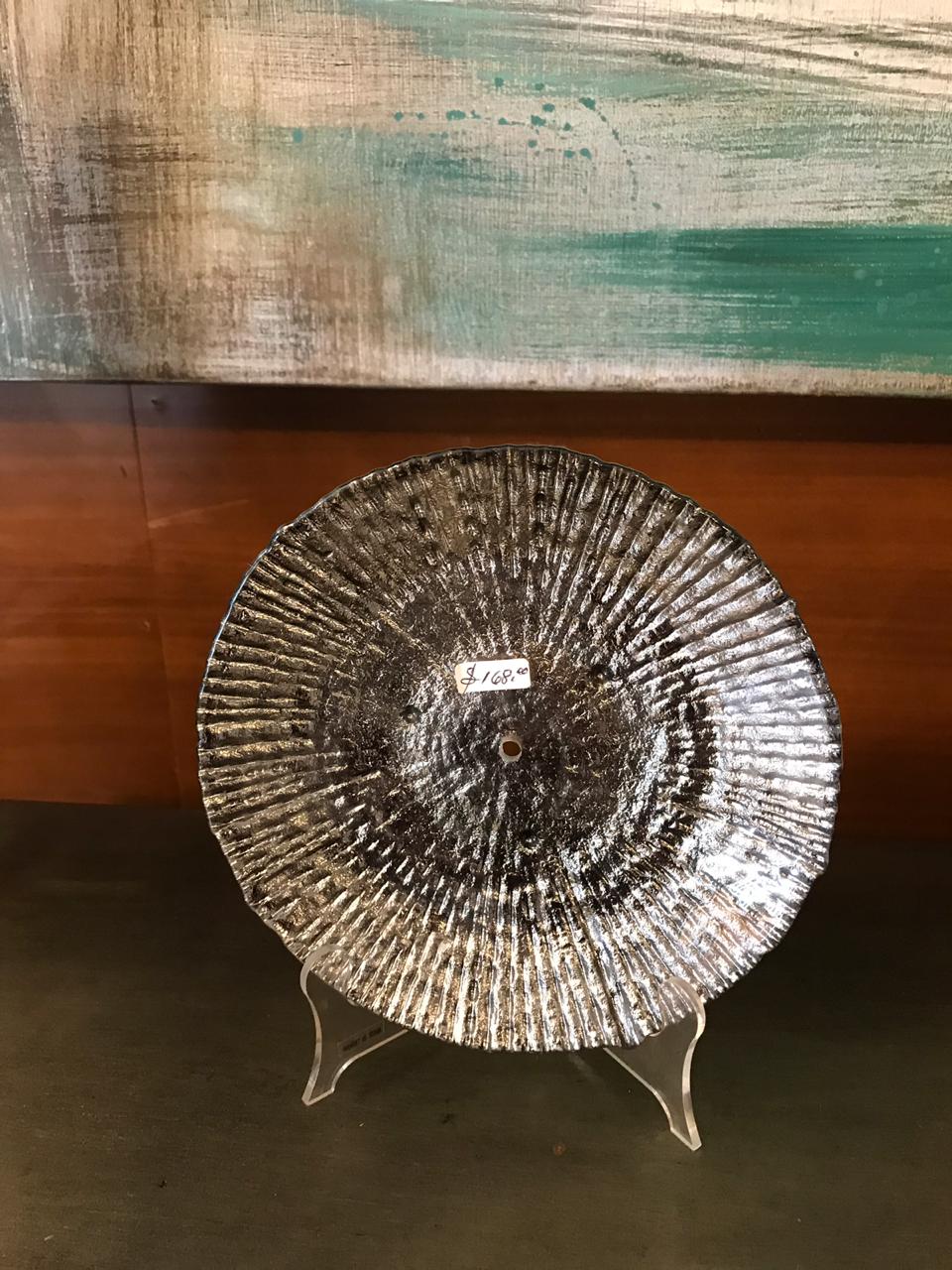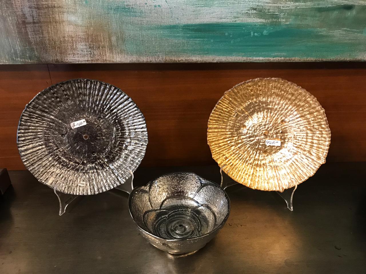 Platos de vidrio pintado montables en pared. Disponible en color plata.