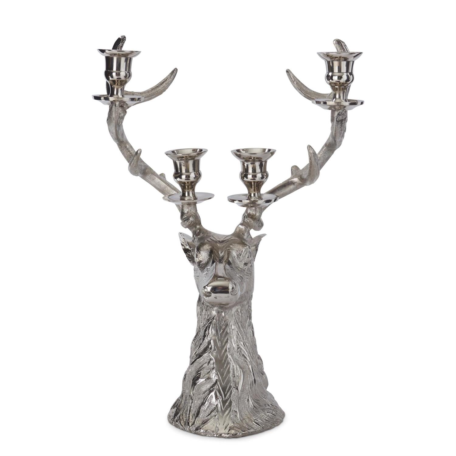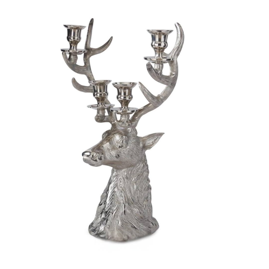 Base de acero en color plateado con acabado burdo de busto de venado con cuernos y bases para cuatro velas. Ideal como centro de mesa o para una credenza.