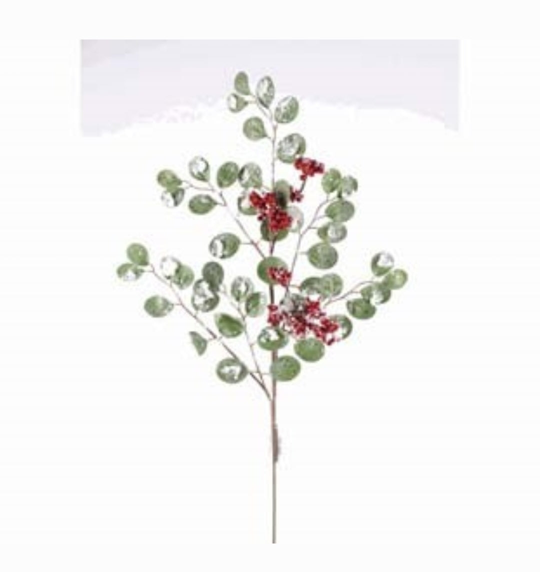 Rama artificial de hojas tipo eucalipto con frutillas rojas de apariencia nevada. 30" de largo