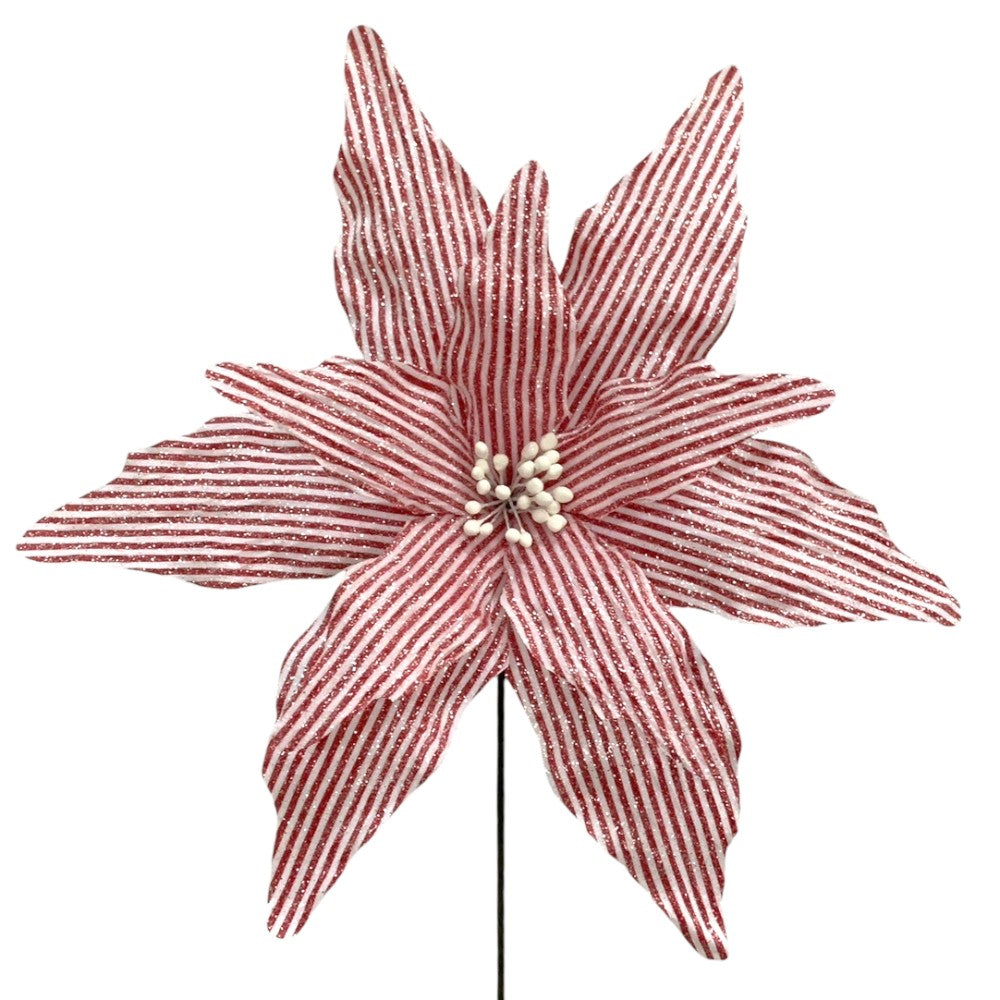 Flor artificial decorativa tipo nochebuena de líneas blanco y rojo 20" de largo cubierta de glitter tipo escarchado.