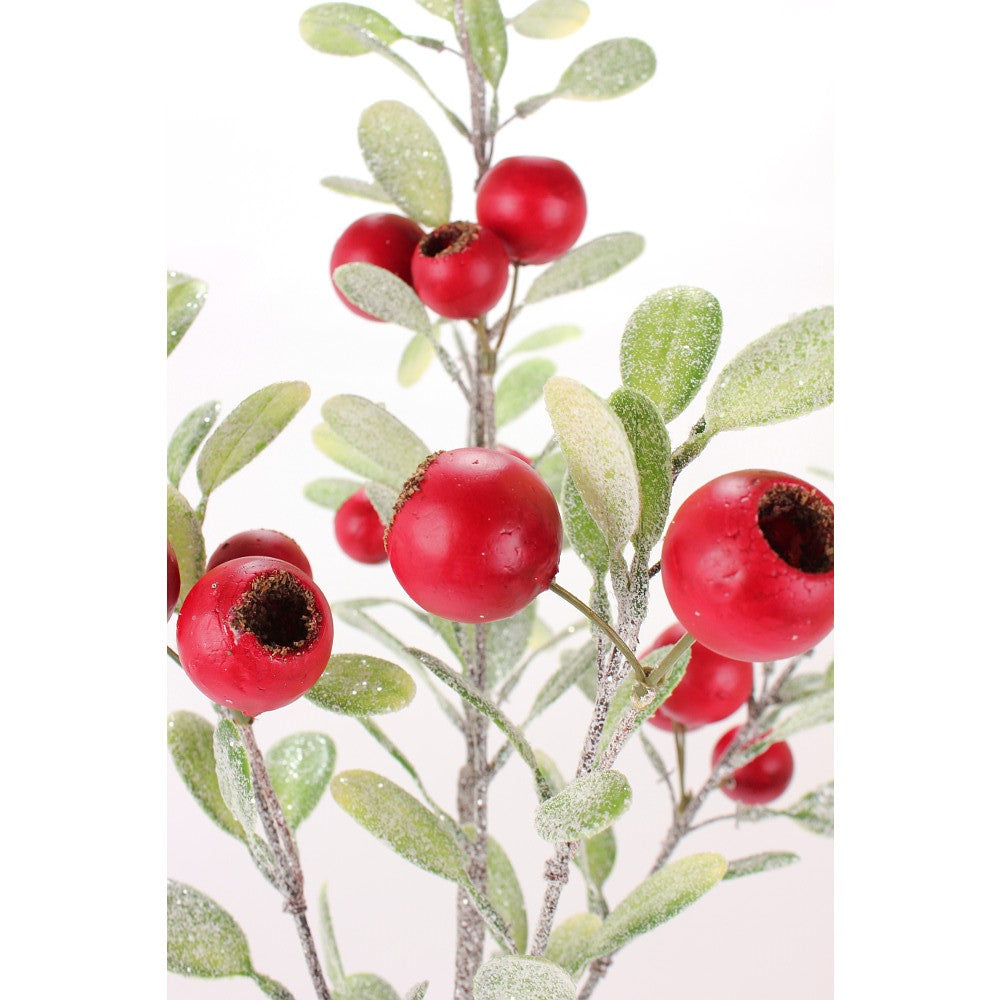 Follaje artificial decorativo navideño, con frutillas rojas de apariencia muy real y nevada.