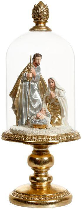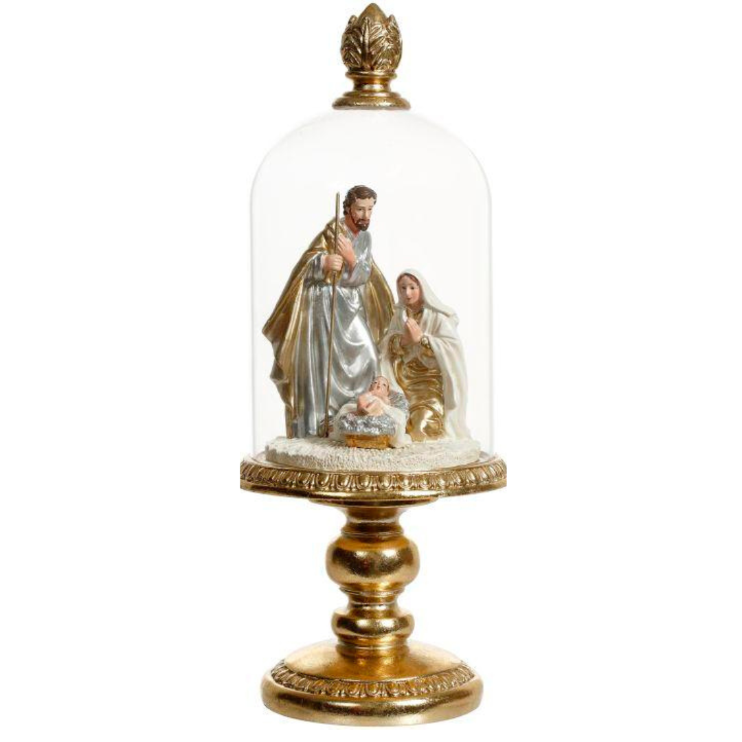 Imagen de la sagrada familia en capelo de cristal sobre base barroca en color dorado 35 cm de alto