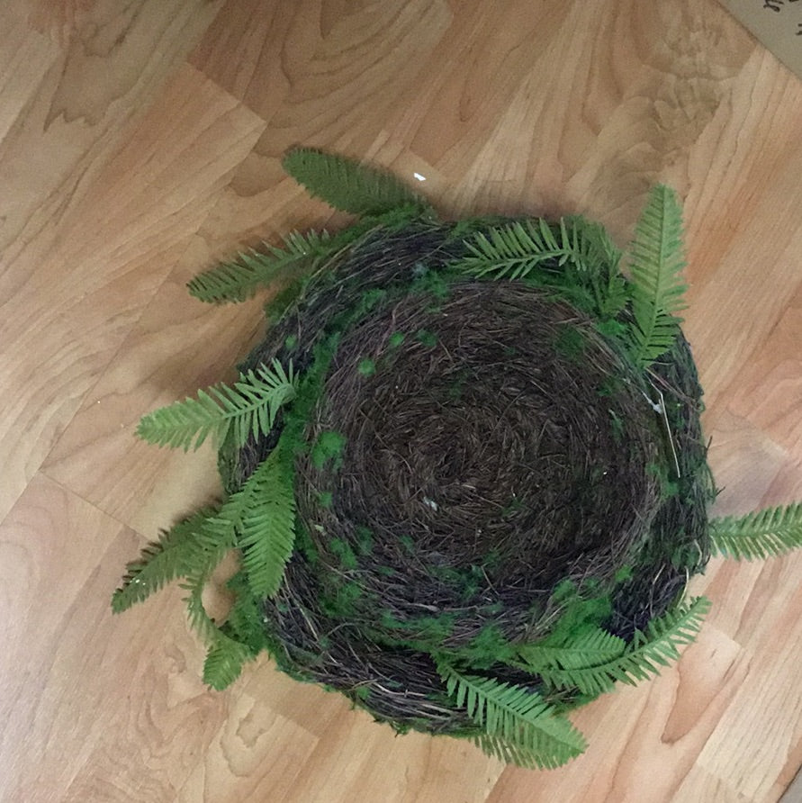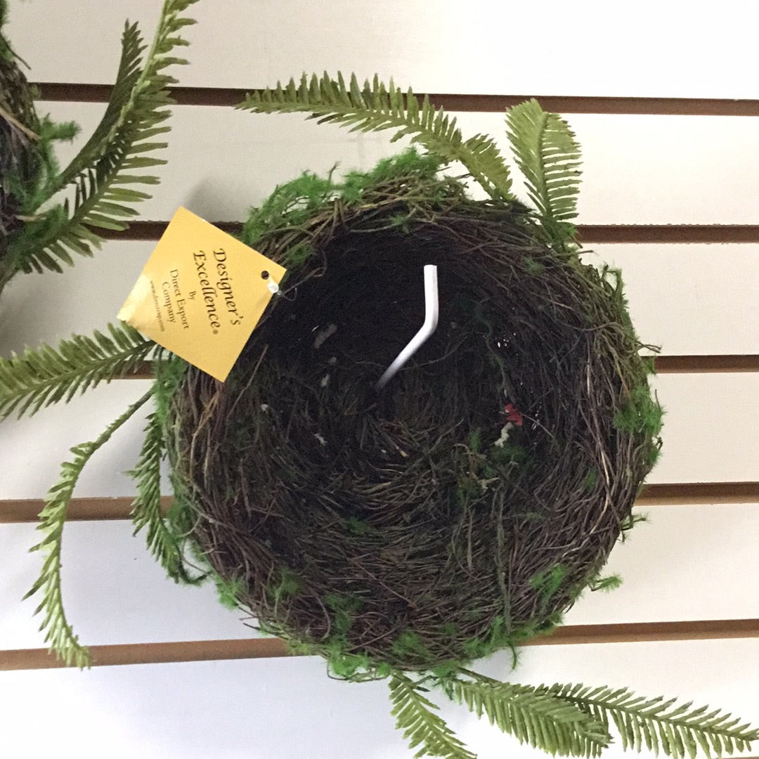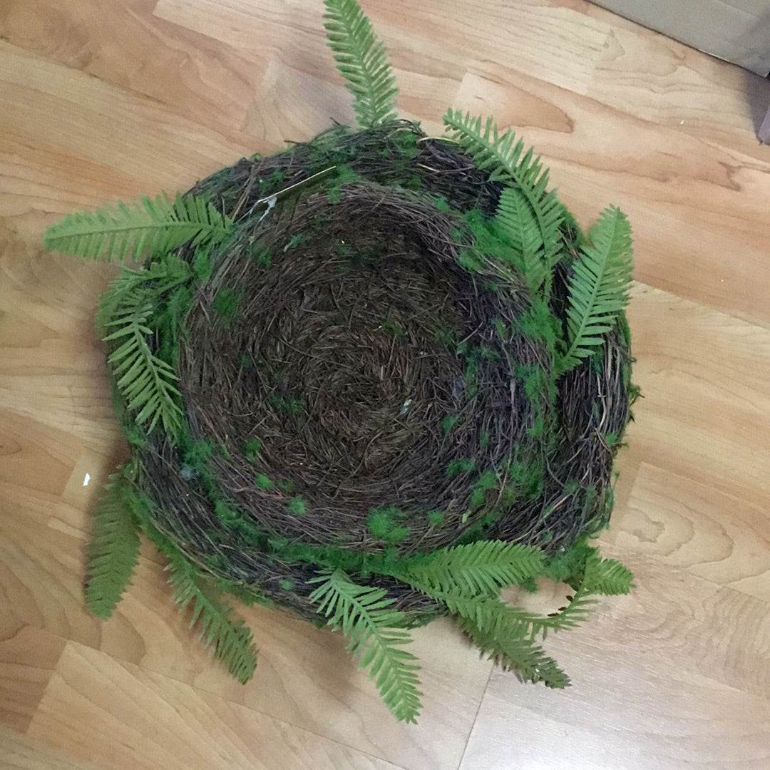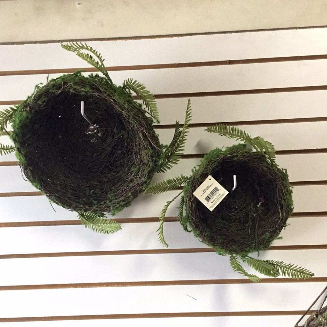 Canastas de raíces y musgo con follaje. Set de dos. 9” y 13” de diámetro.